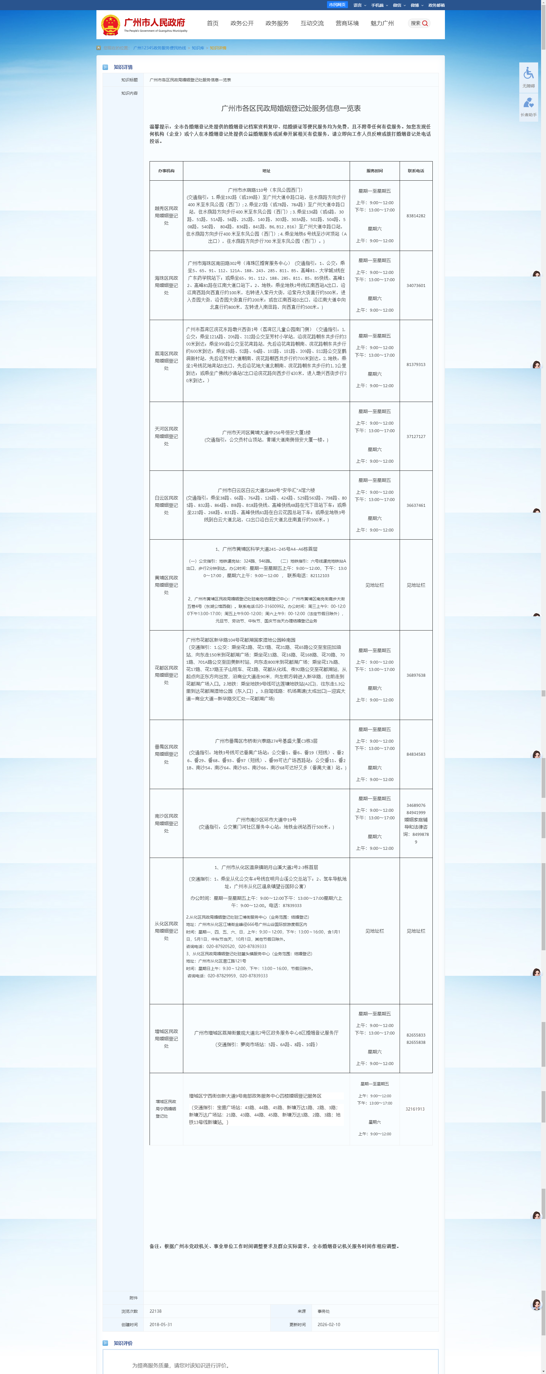 广州各区民政局婚姻登记处服务信息一览表